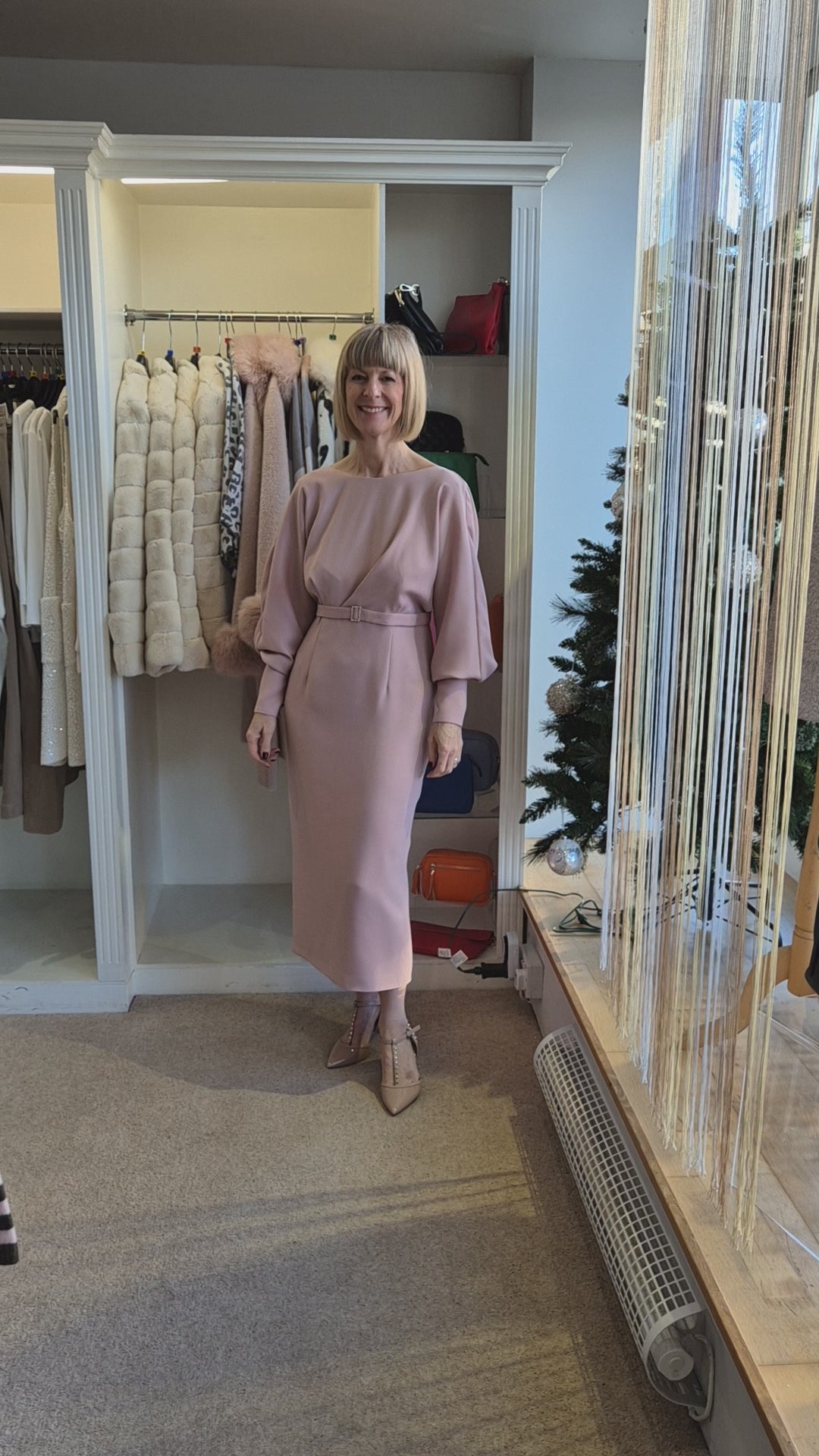 Step into timeless elegance with this stunning rose pink fitted dress, channelling 1940s glamour with a modern twist. The flattering bell sleeves frame your silhouette beautifully, while the ruched bodice detail adds vintage-inspired texture and dimension. A cinched belt emphasises your waist for that classic hourglass shape. Perfect for weddings and special occasions, this Sonia Pena design combines nostalgic charm with contemporary sophistication—because looking fabulous never goes out of style.